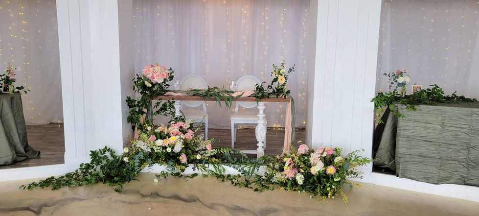This project features elegant event displays with framed photos, greenery, and decorative elements. The images showcase beautifully decorated tables and event setups with a touch of sophistication.